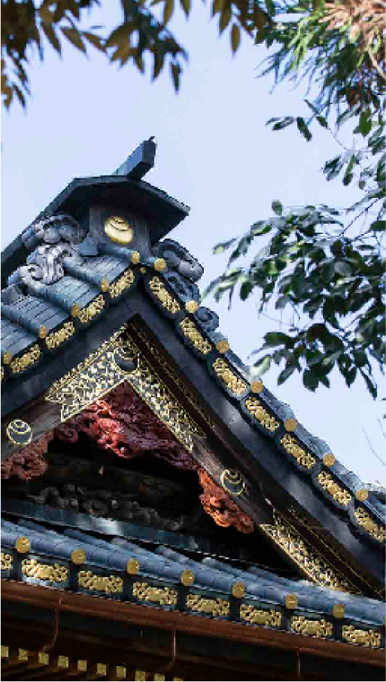 御本殿周囲の彫刻は、当時名匠と言われた後藤縫之助の作「三頭八方睨みの龍」「牡丹唐獅子」、