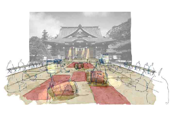 会場となる笠間稲荷神社境内の拝殿前に、むしろを敷詰め、内と外をつなげる設計になっています。